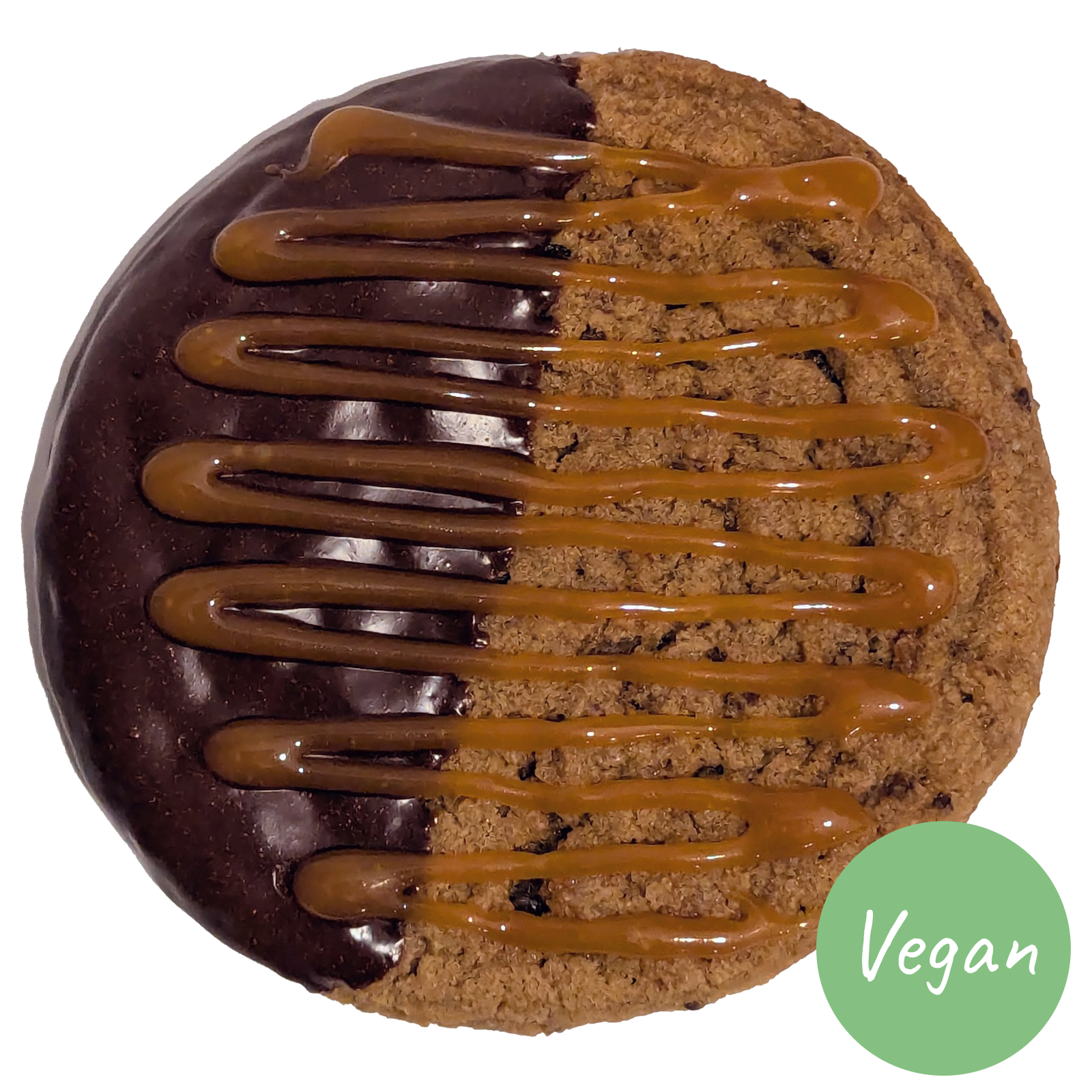 Chocolate and coffee lovers rejoice! This coffee cookie is dipped in a coffee infused dark chocolate before being topped with a salted caramel drizzle. Made with vegan ingredients.
